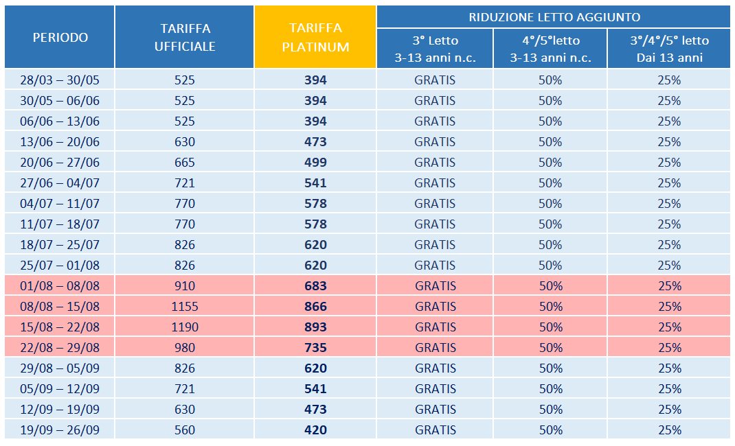 Tessera Club: € 7,00 per persona al giorno dai 3 anni compiuti dal 05/06 al 18/09.