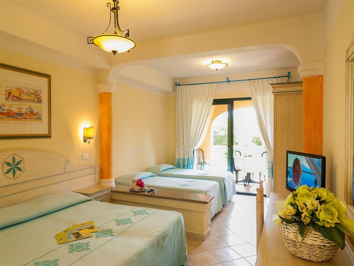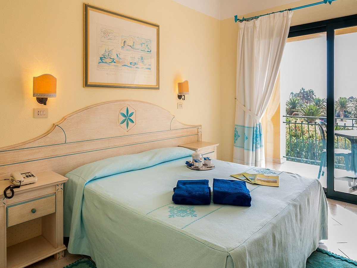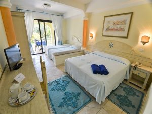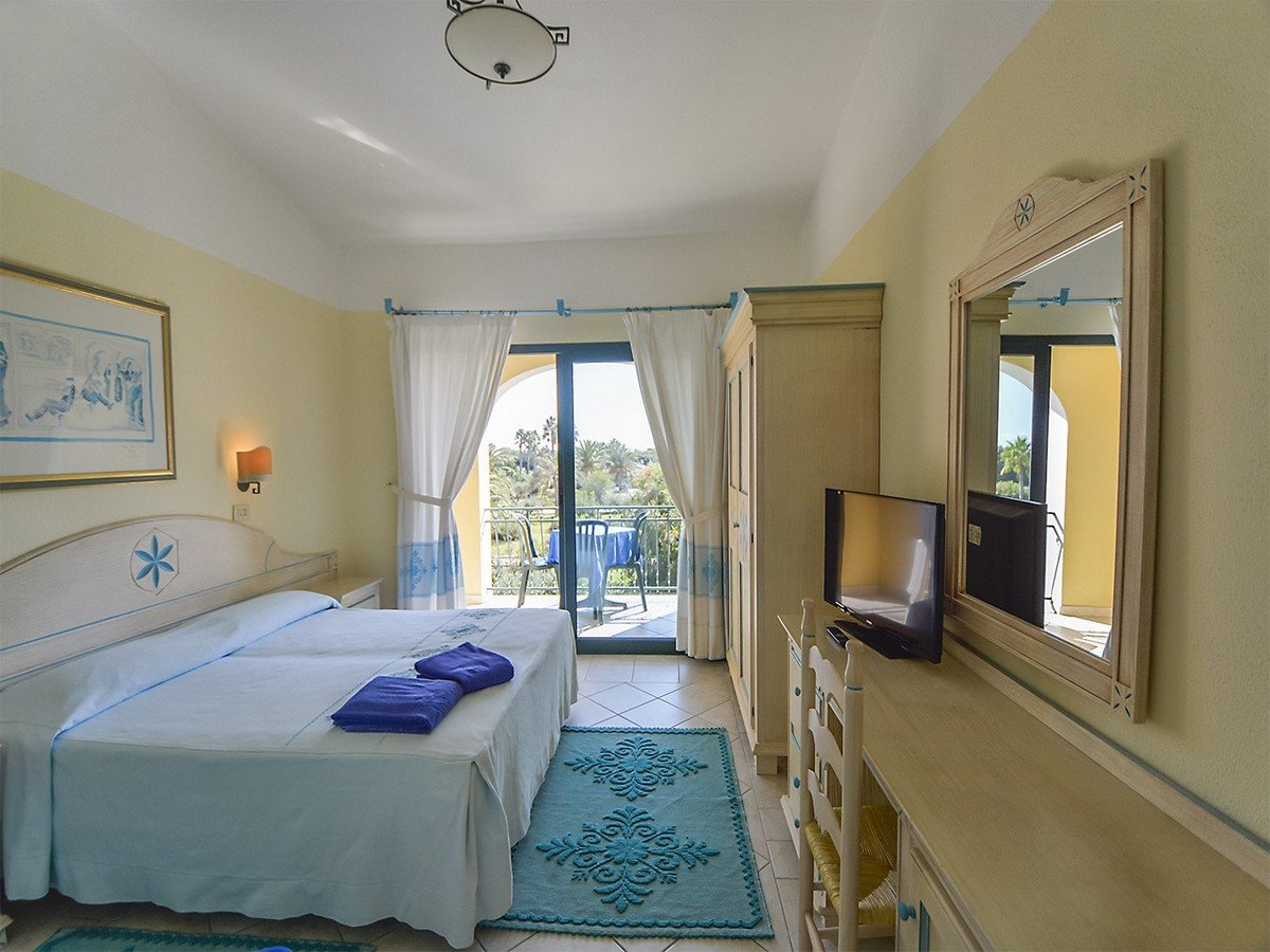 Il Club Hotel Marina Beach è una costruzione a corpo unico, a schema aperto, in stile moresco, articolata su tre piani, rivolta sul parco piscine, dove sono inserite le camere centrali del Resort, il ricevimento, il ristorante, il centro congressi e il bar portico, vicino al quale sorgono, tra gli altri, il teatro, il parco giochi e il corpo camere Marina Garden, distante 200 m. Alcuni bilocali Family, distaccati dal Club Hotel Marina Beach e adiacenti il Marina Garden, offrono una soluzione adatta alle famiglie, con un servizio e due ambienti Le camere sono tutte indistintamente arredate in tipico stile sardo dai colori panna e turchese e si distinguono in camere Doppie, Triple, Quadruple (con letto a castello nel Marina Garden), Quintuple (nel corpo principale) composte da letto matrimoniale più 3 letti aggiunti e Bilocali (solo nel corpo Marina Garden). Sono dotate di veranda coperta attrezzata, servizi privati con asciugacapelli, telefono, aria condizionata e riscaldamento, TV LCD, minibar (consumazioni a pagamento) e cassetta di sicurezza elettronica.