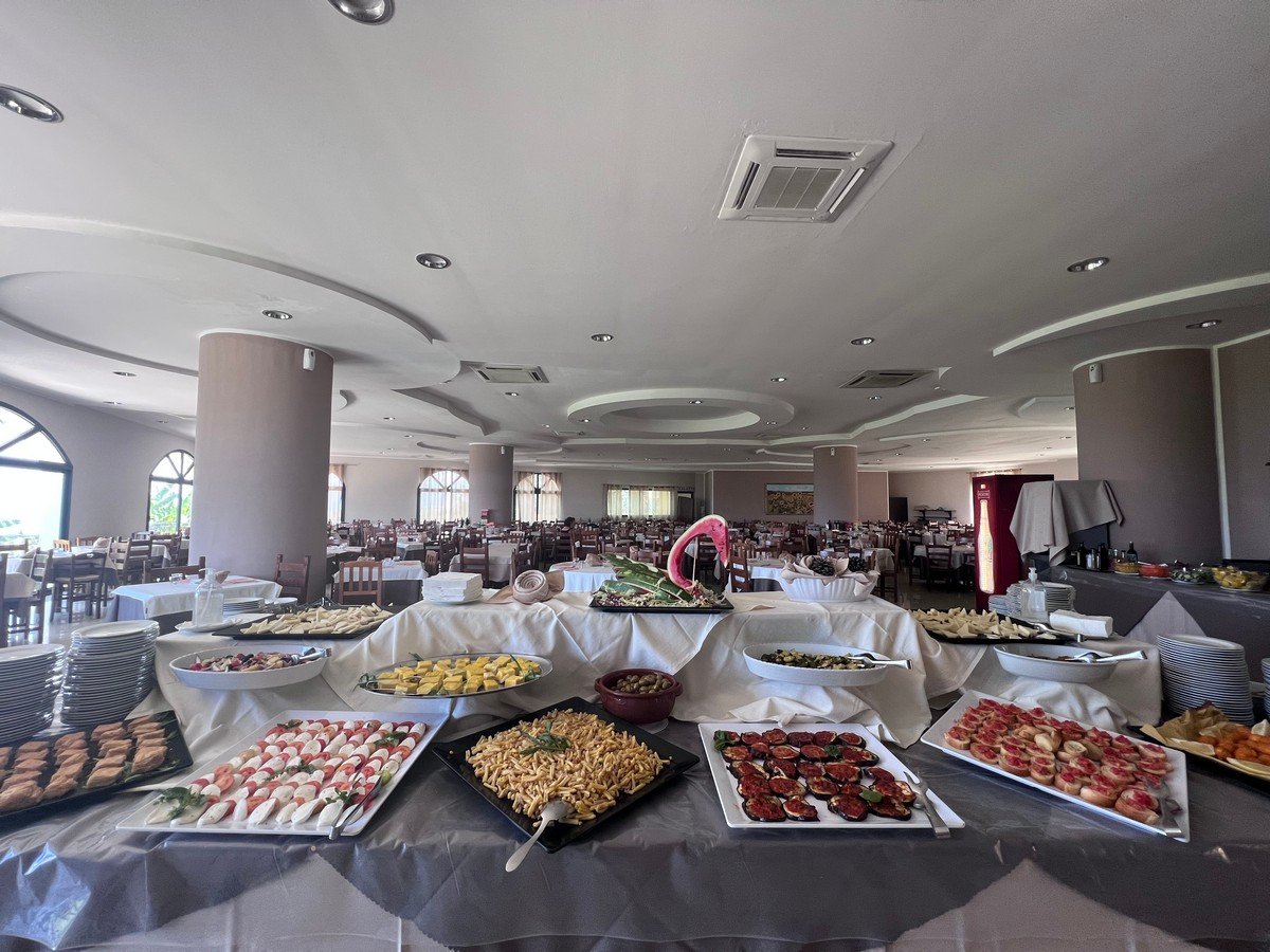 Trattamento Soft All Inclusive: Pensione completa con bevande incluse. American hot buffet breakfast: 07:30 – 09:30; Pranzo: 12:30 – 14:00; a discrezione della Direzione possibilità di doppi turni; 1° Turno alle 12:20-13:20; secondo turno alle 13:30-14:30: a buffet a base di pesce e carne tutti i giorni con antipasti vari, insalate, verdure e contorni; 3 primi piatti; 2 secondi a base di pesce e carne; frutta fresca; Cena: 19:30 – 21:00; a discrezione della Direzione possibilità di doppi turni; 1° turno alle 19:20-20:20; secondo turno alle 20:30-21:30: a buffet a base di carne e pesce con antipasti vari, insalate, verdure e contorni; 3 primi + 1 zuppa; 2 secondi a base di pesce e carne; dolce; Bevande Incluse: In sala ristorante: (durante servizi di pranzo e cena) acqua microfiltrata, naturale e frizzante in caraffa; vino della casa in caraffa; soft drink (spinati); birra alla spina; Bar centrale (dalle ore 09:30 e fino alle ore 21:30) e Bar spiaggia (dalle ore 09:30 e fino alle 18:00): soft drink/bevande analcoliche (solo alla spina) ossia acqua microfiltrata, cola, aranciata, acqua tonica, succhi di frutta. Consumazioni non incluse come sopra specificato verranno considerate extra da pagare. Le bevande consumate al di fuori dei suddetti orari verranno considerate extra da pagare. Cucina Mamme non presente è possibile rivolgersi al maìtre di sala. Previsti pasti senza glutine, da segnalare alla prenotazione, alimenti base pre-confezionati senza supplemento.