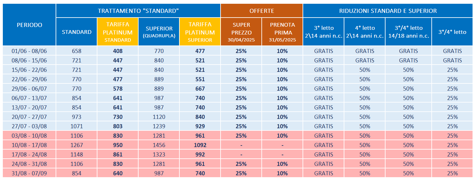 Tessera Club obbligatoria (escluso i periodi dal 31/05 al 13/06) € 125,00 a camera doppia a settimana; € 130,00 a camera tripla a settimana; € 160,00 a camera quadruple e quintuple a settimana;